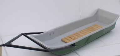 Сани-прицеп представляют собой стеклопластиковый прямоугольный корпус. На дне отформованы две лыжи в виде выдавок по всей длине корпуса. Лыжи подшиты накладками из морозостойкого полиэтилена. К корпусу саней шарнирно прикреплено дышло с амортизационно-поглощающим устройством.